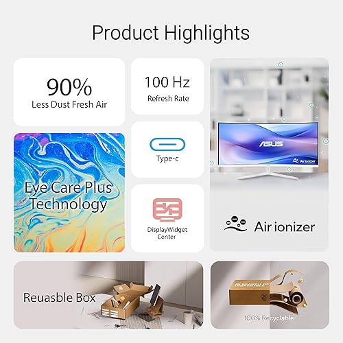 ASUS 34” Ultra-Wide Curved Eye Care Monitor (VU34WCIP-W) – WQHD (3440x1440), 1500R Curvature, Frameless, 100Hz, Nano-ion, SmoothMotion, Eye Care Plus, USB-C PD 65W, Speakers
