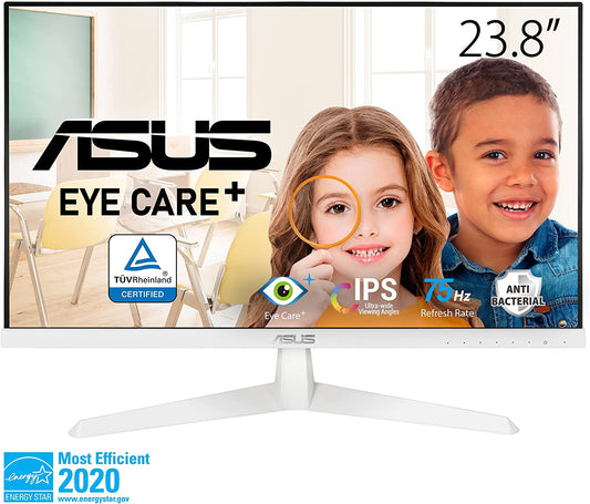 ASUS VY249HE-W 23.8” 1080P Monitor - White, Full HD, 75Hz, IPS, Adaptive-Sync/FreeSync, Eye Care Plus, Color Augmentation, Rest Reminder, Antibacterial Surface, HDMI, VGA Frameless VESA Wall Mountable
