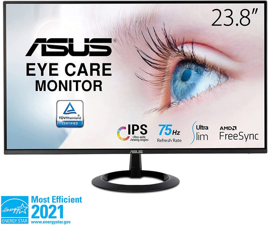 ASUS 23.8” 1080P Monitor (VZ24EHE) - Full HD, IPS, 75Hz, 1ms, Adaptive-Sync/FreeSync, Low Blue Light, Flicker Free, Ultra-Slim, VESA Mountable, Frameless, HDMI, VGA 23.8" IPS FHD 1ms 75hz Frameless