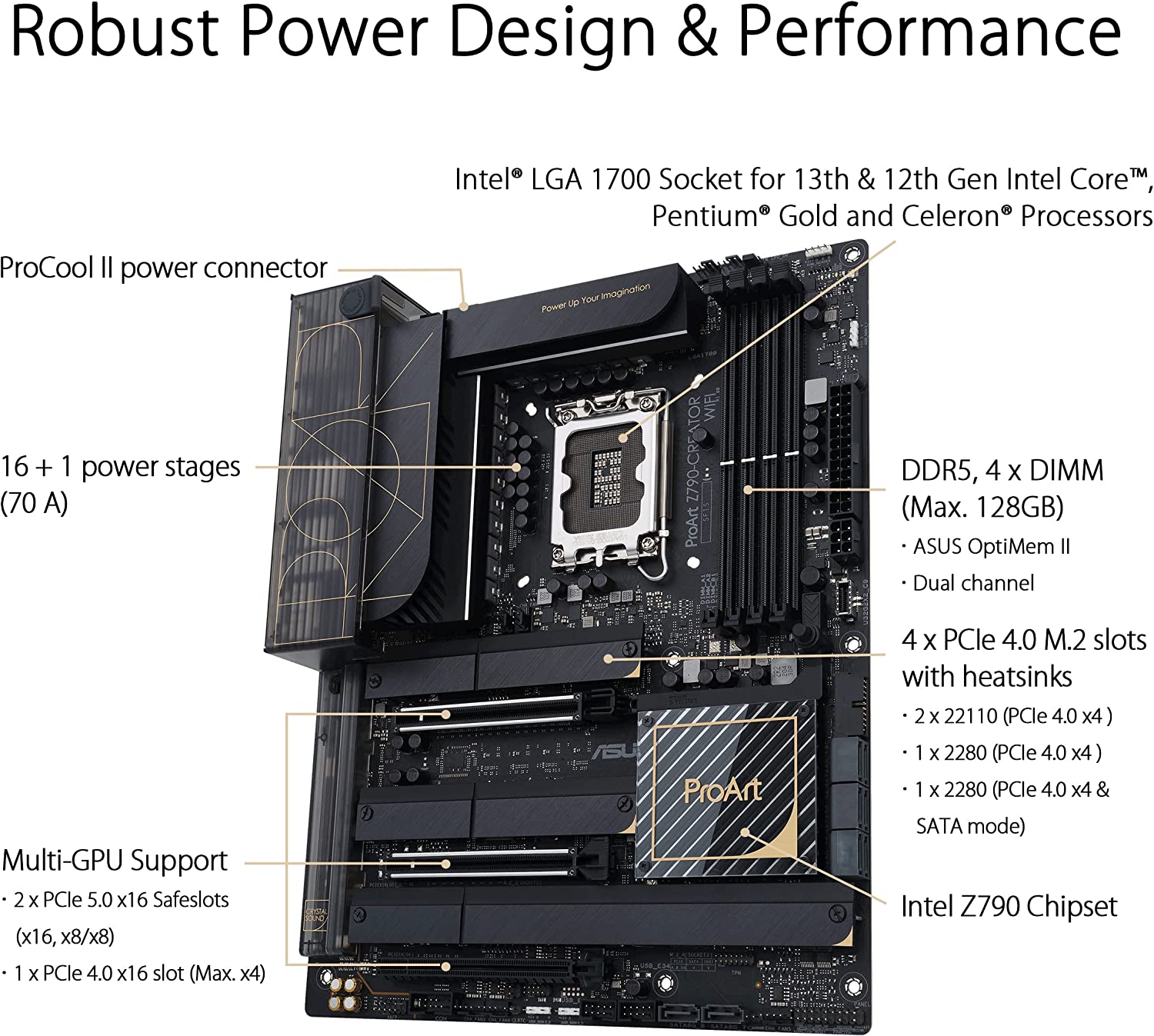 The ASUS ProArt Z790-Creator WiFi 6E perfects the art of performance, empowering creativity and maximizing the computing power of the latest 12th&13th Generation Intel® Core™ processors with powerful hardware and software, efficient cooling and lightning-fast connectivity, including Thunderbolt™ 4, 10 Gb and 2.5 Gb onboard Ethernet, and WiFi 6E.