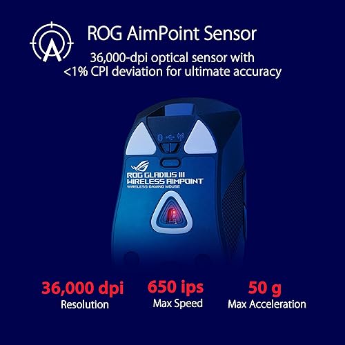 ASUS ROG Gladius III Wireless AimPoint Gaming Mouse, Connectivity (2.4GHz RF, Bluetooth, Wired), 36000 DPI Sensor, 6 programmable Buttons, ROG SpeedNova, Replaceable switches, Paracord Cable, Black
