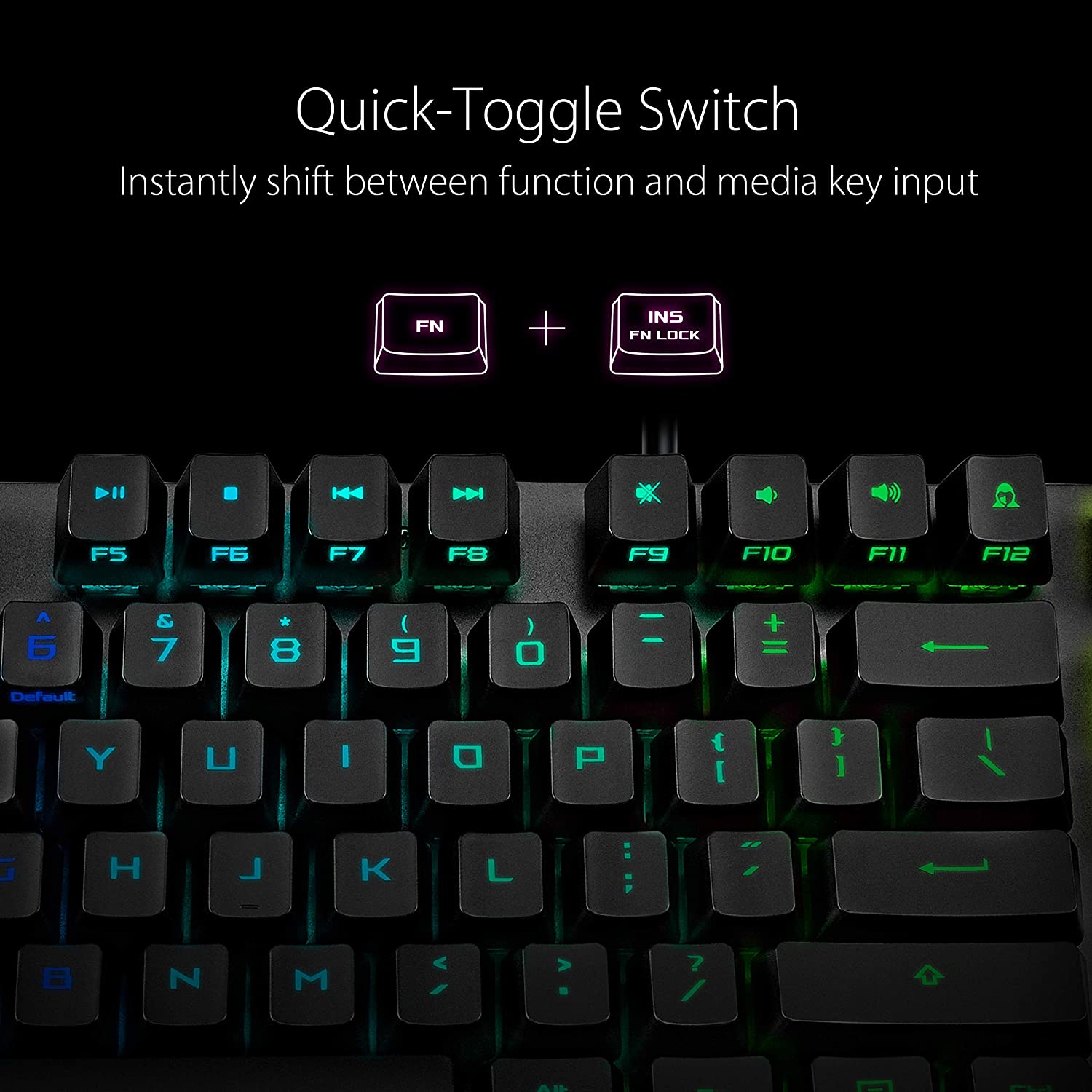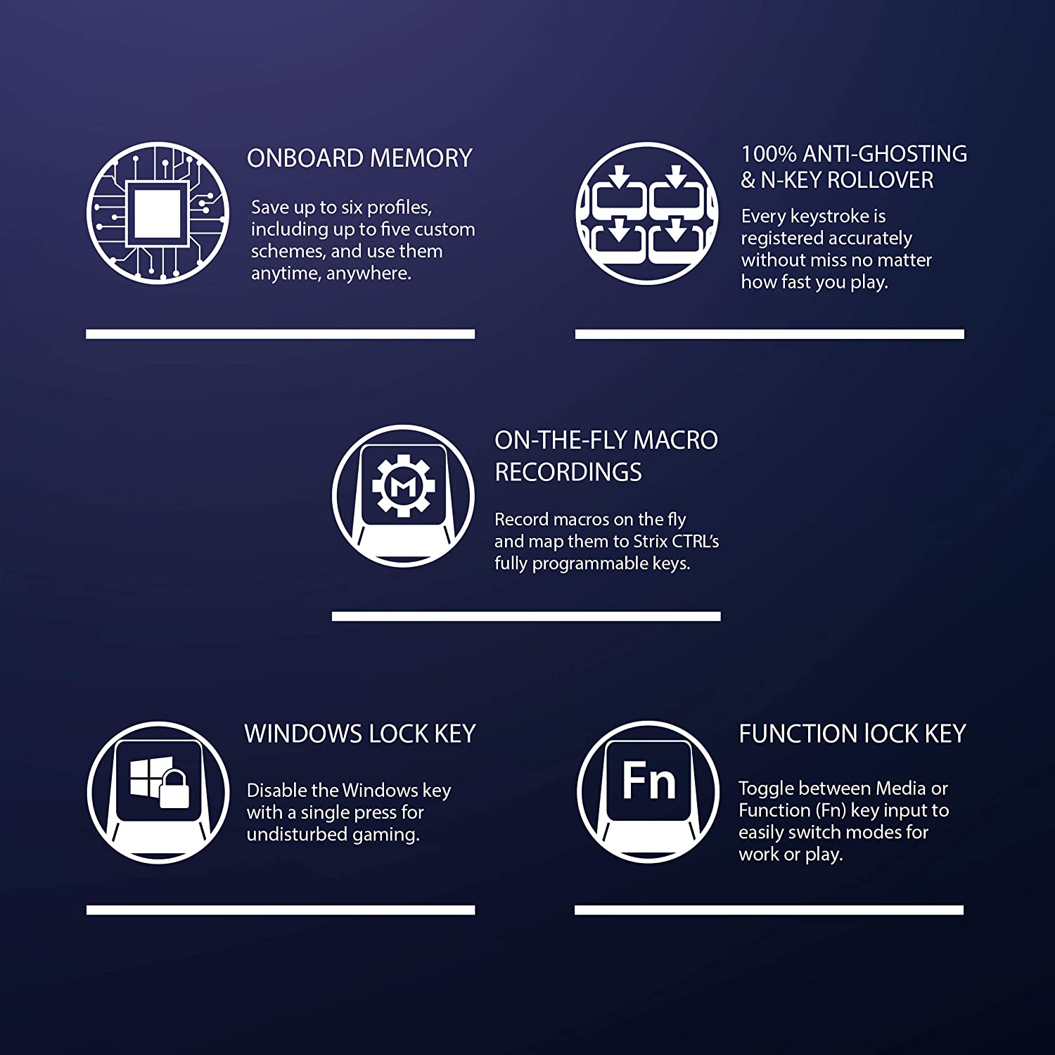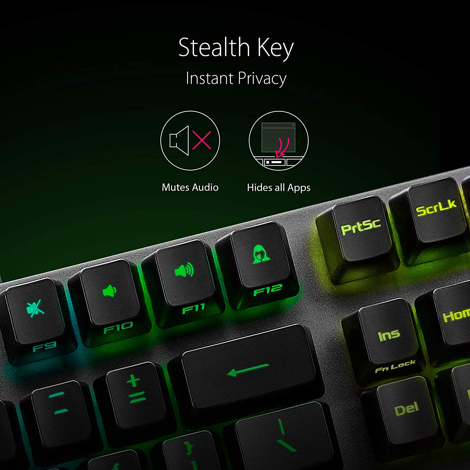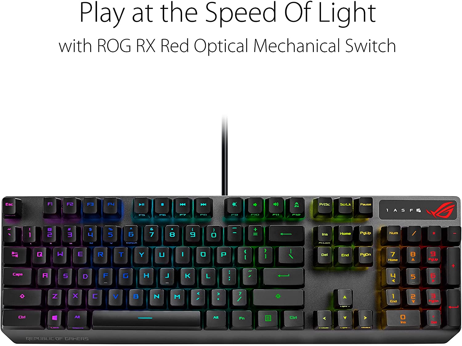 Take on all comers with ROG Strix Scope RX, the first mechanical RGB gaming keyboard featuring exclusive ROG RX Red Optical Mechanical Switches. These switches provide a 100-million-keystroke lifespan and offer consistent linear keystrokes with immediate response. In addition, each switch has a central RGB LED to give every key all-round lighting. Strix Scope RX also offers IP57 waterproof and dust resistance, an alloy top cover, and USB 2.0 passthrough. Like all Strix Scope series gaming keyboards, it has a wider Ctrl key and a Stealth key for FPS gamers. Go confidently into battle with ROG Strix Scope RX. ROG RX Red Optical Mechanical Switches are the first to be developed by ROG. Extensive research, testing and fine-tuning have resulted in switches with a 1.5mm actuation point for lightning-fast inputs. An initial force of 40gf prevents accidental keystrokes, and goes all the way up to 55gf for perfect rebound feedback. ROG RX Red switches provide a smooth and linear feel to give you near instantaneous response the moment you strike the key. ROG Strix Scope RX offers industry-leading IP57 waterproof and dust resistance, ensuring it’s well-protected from spills and dust. It also has a durable aluminum alloy top plate that provides structural rigidity to give you long-lasting and reliable performance. Convenient USB 2.0 passthrough lets you plug in a mouse or flash drive, or charge mobile devices. After studying the play style of FPS gamers, the ROG R&D team created Xccurate Design: a Ctrl key that’s twice as wide as usual. In the heat of battle, the larger size makes it easy to quickly find and hit.