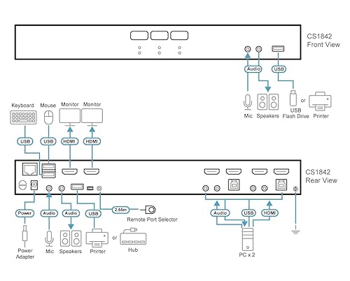ATEN CS1842 2-Port True 4K HDMI Dual-View KVM Switch with Audio & USB 3.0 Hub, Black International Version