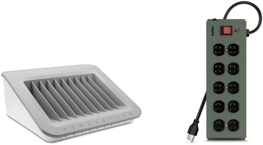 Belkin Store and Charge (AC Classroom Charging Station for Laptops, Tablets) & 10-Outlet Metal Power Strip Surge Protector, 15ft Cord AC Charge Charging Station + Charger