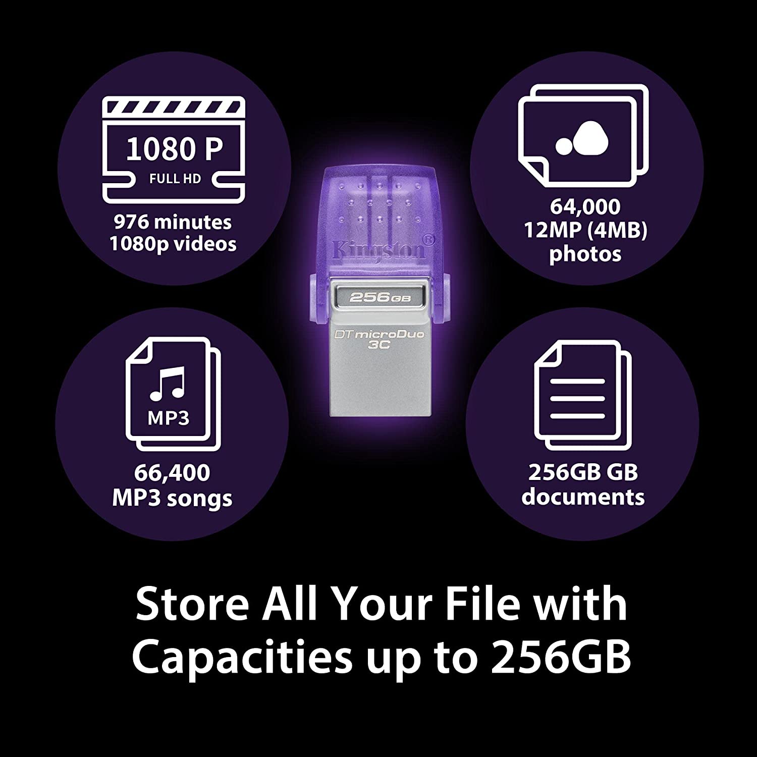 DataTraveler microDuo 3C has a dual interface that works with both newer USB Type-C and traditional USB Type-A ports. It’s an ideal way to free up space on your smartphone or tablet with up to 256GB of extra storage for your photos and videos. The eye-catching form factor offers convenient plug and play connectivity. Transfer files quickly between your devices with USB 3.2 Gen 1 speeds of up to 200MB/s read