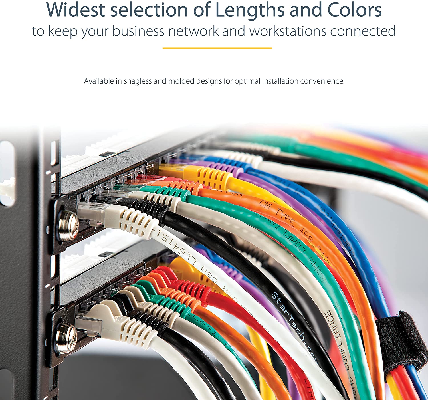 StarTech 5 ft Blue Snagless Cat6 UTP Patch Cable- ETL Verified RJ45 connector clip protectors help keep the plugs from snagging while routing the cable, for easier Cat 6 cable runs. RJ45 connector clip protectors. Carefully constructed and tested, to keep Near End Crosstalk (NEXT) well within acceptable limits. Colored hoods for departmental color coding. Molded strain relief prevents the cable from being bent at sharp angles at the RJ45 connector, to minimize the stress at the plug termination point. Constructed with top quality components. 1 x RJ-45 Male Network. Gold-plated Contacts.