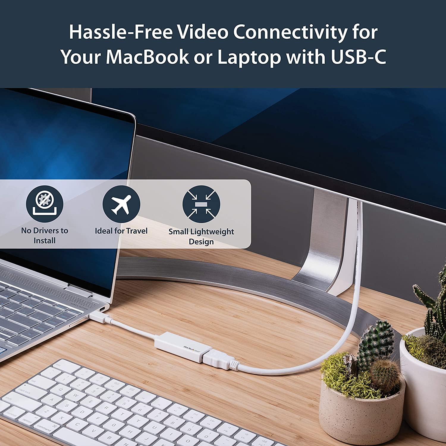 This USB C to HDMI adapter lets you connect your USB Type-C laptop or MacBook to an HDMI monitor, projector or display with support for Ultra HD 4K 60Hz. Astonishing Picture Quality The USB C to display converter lets you harness the video capabilities that are built into your USB-C connection (Thunderbolt 3, USB 3.1 or USB 3.0), to deliver the astonishing quality of UHD to your 4K display and supporting resolutions up to 3840 x 2160. Plus, the adapter is backward compatible with 1080p displays, which makes it a great accessory for home, office or other work environments. Hassle-Free Connection with USB Type C This USB C dongle lets you utilize the versatile USB Type-C port on your portable device. USB Type-C is a reversible connector, so it doesn't matter which way you plug it in. To ensure easy operation and installation, this USB C to DisplayPort cable works with both Windows and Mac computers and allows for plug-and-play installation, removing the need for any additional software or drivers. Ultimate Portability The adapter is the perfect accessory for your new slim USB-C device, fitting easily into your laptop bag or carrying case, which is great for BYOD (Bring Your Own Device) applications at the office. 4K HDMI adapter is backed by a 3-year StarTech. Note: Your USB-C equipped device must support video to work with this adapter. For Mac users: This product may experience display detection issues with certain models of Mac. If you're experiencing issues please contact our technical support. For hassle-free compatibility with Mac we recommend CDP2HD4K60H.
